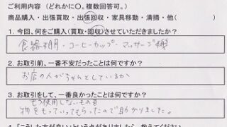お客様の声 お客様の声|出張買取・不用品回収 食器棚(マルニ地中海の食器棚) ご利用サービス 不用品の出張回収 今回、何をご購入(買取・回収)させていただきましたか? 食器棚・コーヒーカップ・マッサージ機 お取引前、一番不安だったことは何ですか? お店の人がちゃんとしているか お取引をして、一番よかったことは何ですか... 2025.10.14 お客様の声