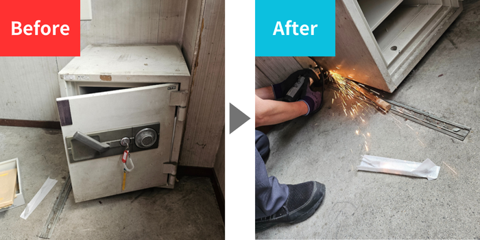 現地を確認したところ、その金庫は盗難防止を目的としたアンカーボルトによって床面にしっかりと固定されているタイプでした。通常の運搬作業では外すことができないため、専門の知識と専用工具が必要となります。当社ユーズドレスキューでは、これまでに数多くの金庫回収を行ってきた経験があり、アンカーボルトで固定された重量金庫の取り外しや搬出の実績も豊富にございます。専用の工具や資材を使用し、安全かつ迅速に取り外し作業を行いました。